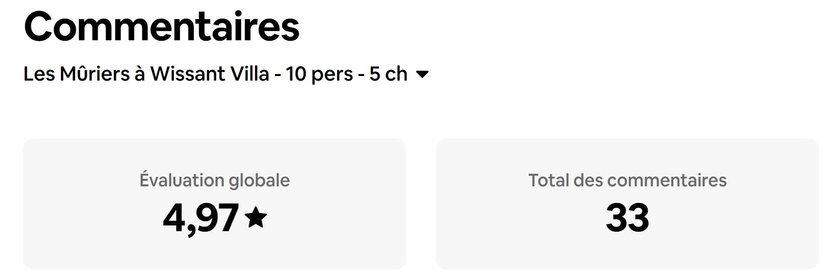 Fin 2024, 33 commentaires concernant la Villa Les Mûriers ont été déposés sur Airbnb avec une évaluation globale de 4,97 sur 5.